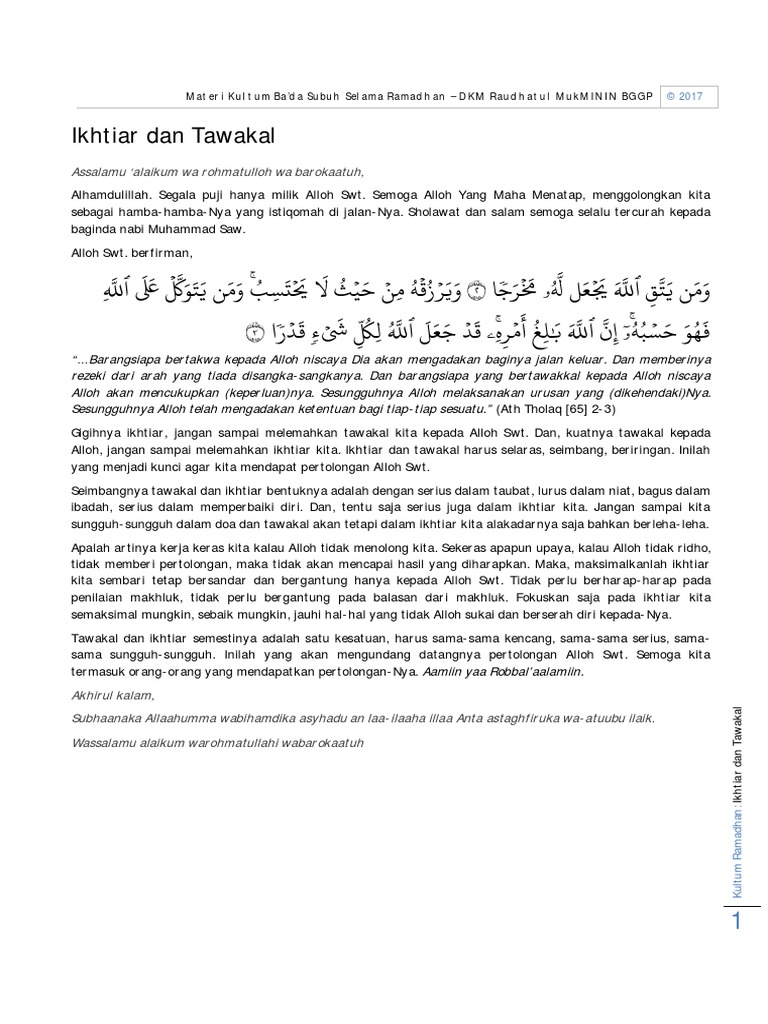Arsip Berita from pa-padangsidempuan.go.id Contact materi kultum kita on messenger. Ide materi kultum ramadhan ringan dan singkat. Demikian kultum yang dapat saya sampaikan. Kultum yang disampaikan di bulan ramadhan memang harus istimewa, karena bulan ramadhan juga merupakan bulan yang istimewa. Jelaskan hubungan antara ikhtiar dan tawakkal? Rangkaian contoh materi kultum ramadhan. Hakikat tawakkal adalah sebagaimana yang di sampaikan oleh imam ibnu rajab رحمه هللا. الحمد لله، والصلاه والسلام على رسول الله نبينا pencarian:kultum singkat tentang ikhlas, materi kultum singkat yang menarik, materi kultum.